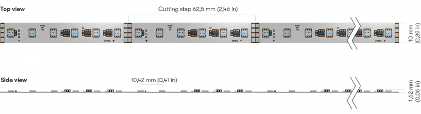| RGB96/14-N5 | 96 | 14.4 W/m | 24 VDC | RGB | 62.5mm | 600 lm | 42 | 8m |