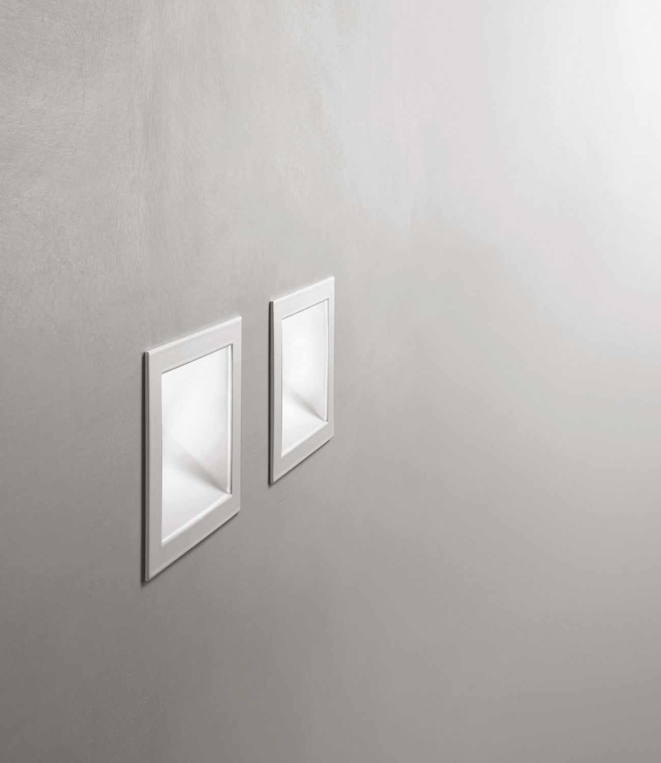 Indoor recessed unit made from white painted steel sheets. Wired with LED. Emission of indirect asymmetric light.