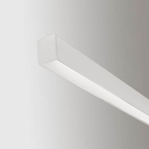 Modular system for single luminaire or continuous files, made of aluminum in minimal version with wire diffuser, low contrast for general light with opal screen, high contrast with prismized diffuser with controlled luminance.